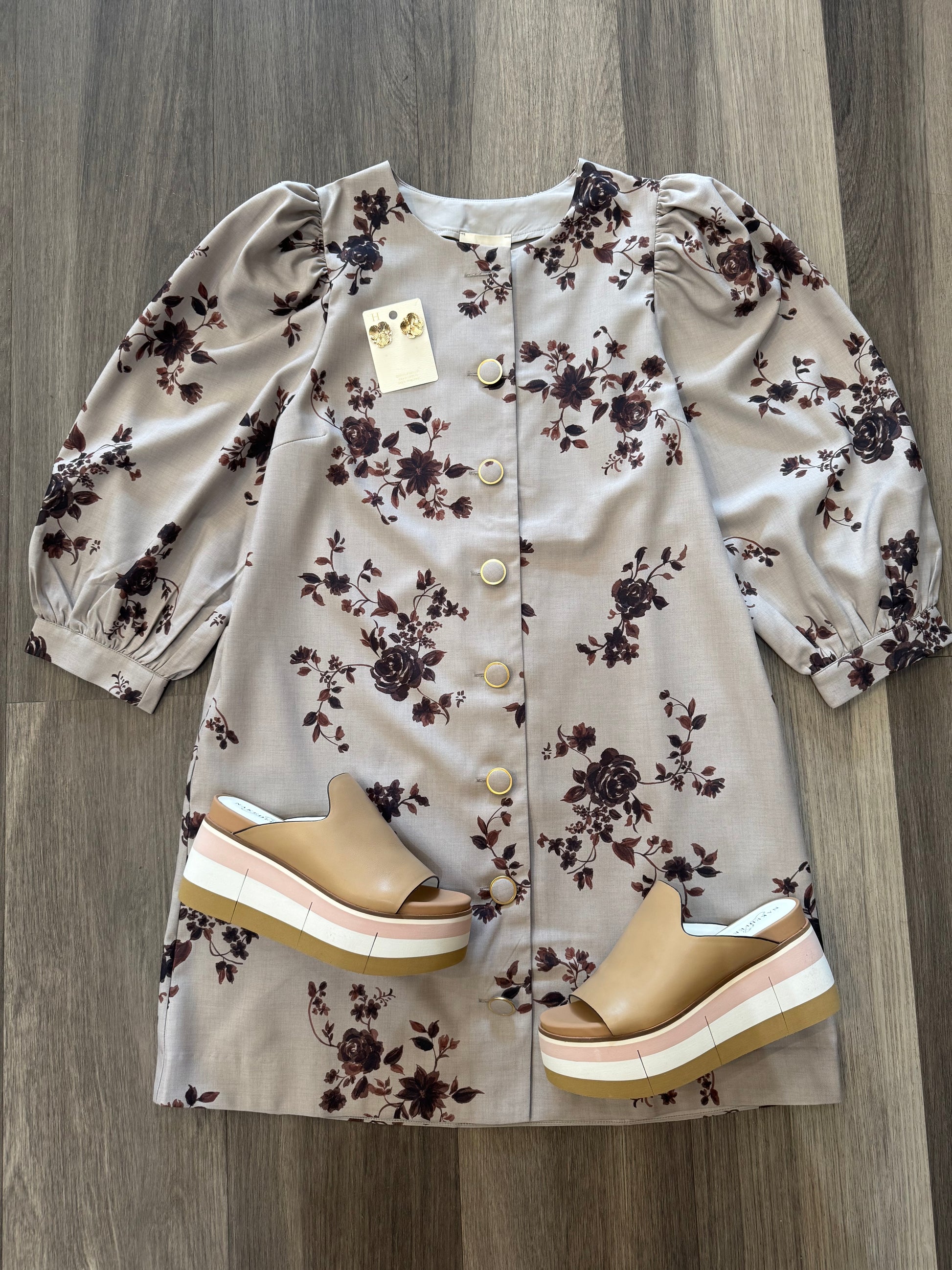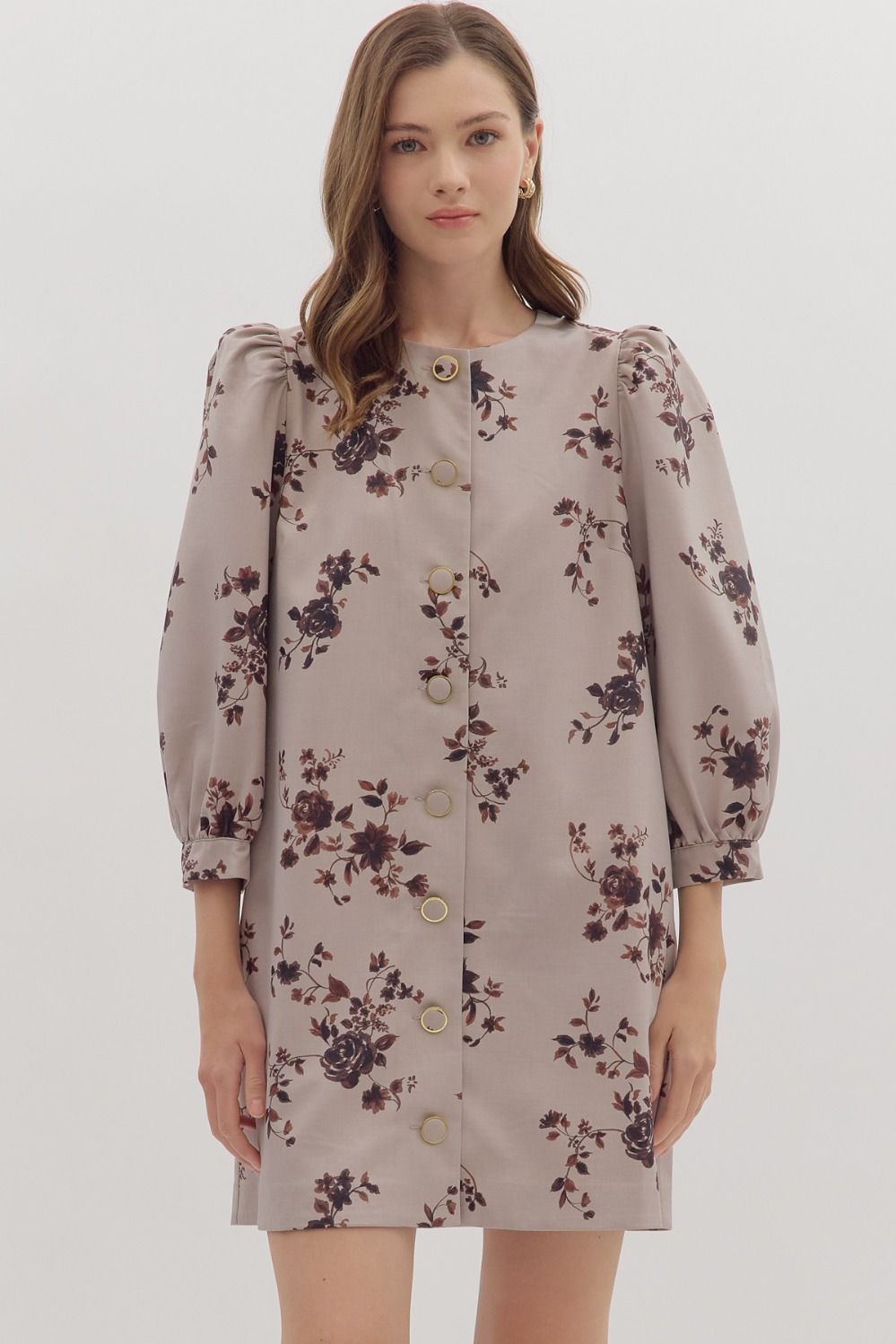Floral print long puff sleeve mini dress featuring button closure at front. Side pockets. Unlined. Woven. Non-sheer. Lightweight.