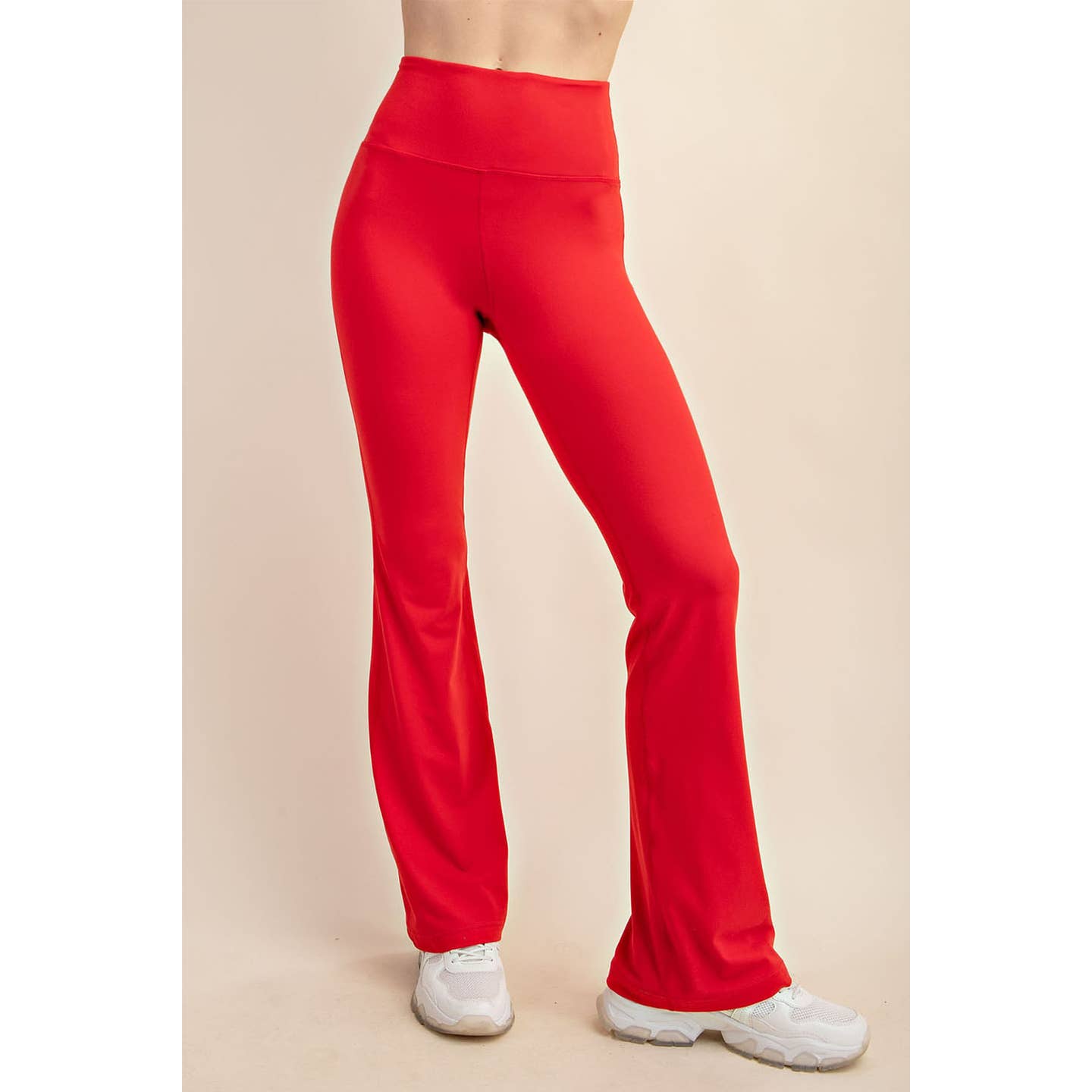 • Details: These high-waisted, flared pants offer a flattering and elongating silhouette with a smooth, sculpting fit through the hips and thighs. The bold red color adds a vibrant pop, while the soft, stretchy fabric allows for all-day comfort and movement. Ideal for both casual wear and elevated athleisure looks.
