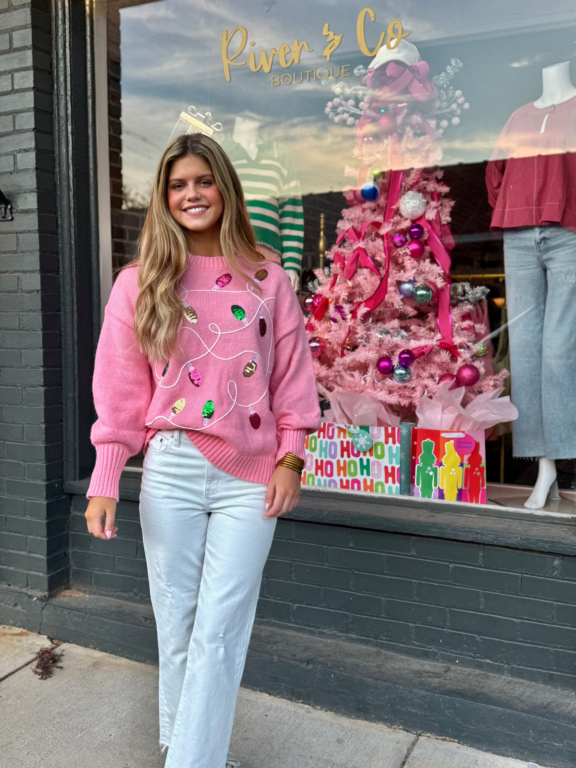 Ribbed Crew neckline - Colorful Christmas lights with sequin embellishment accent - Embroidered Cozy knitted sweater - Casual Drop shoulder Long-sleeve, ribbed hem - Pullover style - Soft touch - Relaxed fit - Embrace the Cozy Charm of Winter With Our Christmas-Light. - Sequin Detail Knit Sweater. - Get ready to strut your stuff in style - Christmas, Holiday, Day Party, Everyday, Work, Fall, Winter