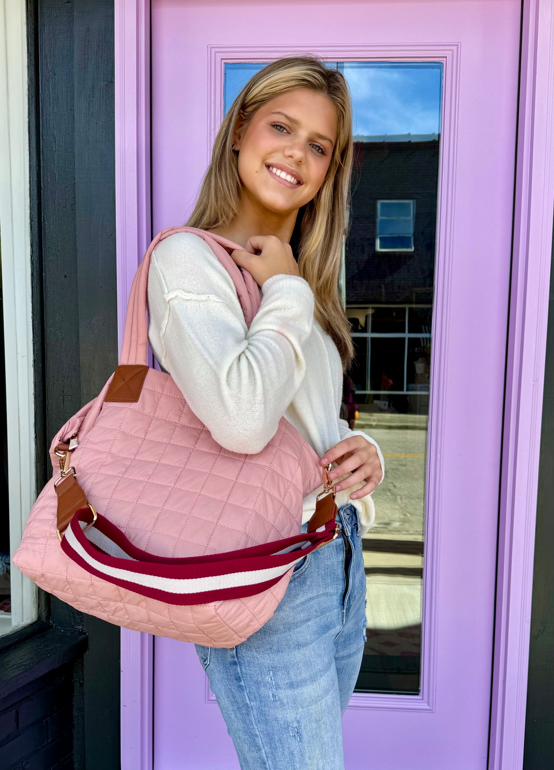 L14 x W6 x H9 nylon , gold hardware, double handles, detachable strap, top zip closure, outer zip closure, 2 inner slip pockets