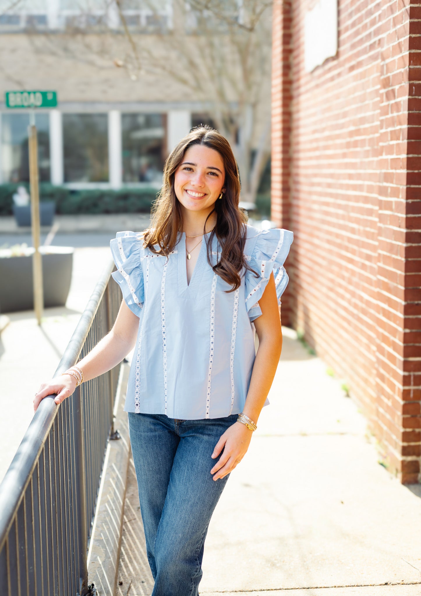 Lace Trim Poplin Top: Chambray