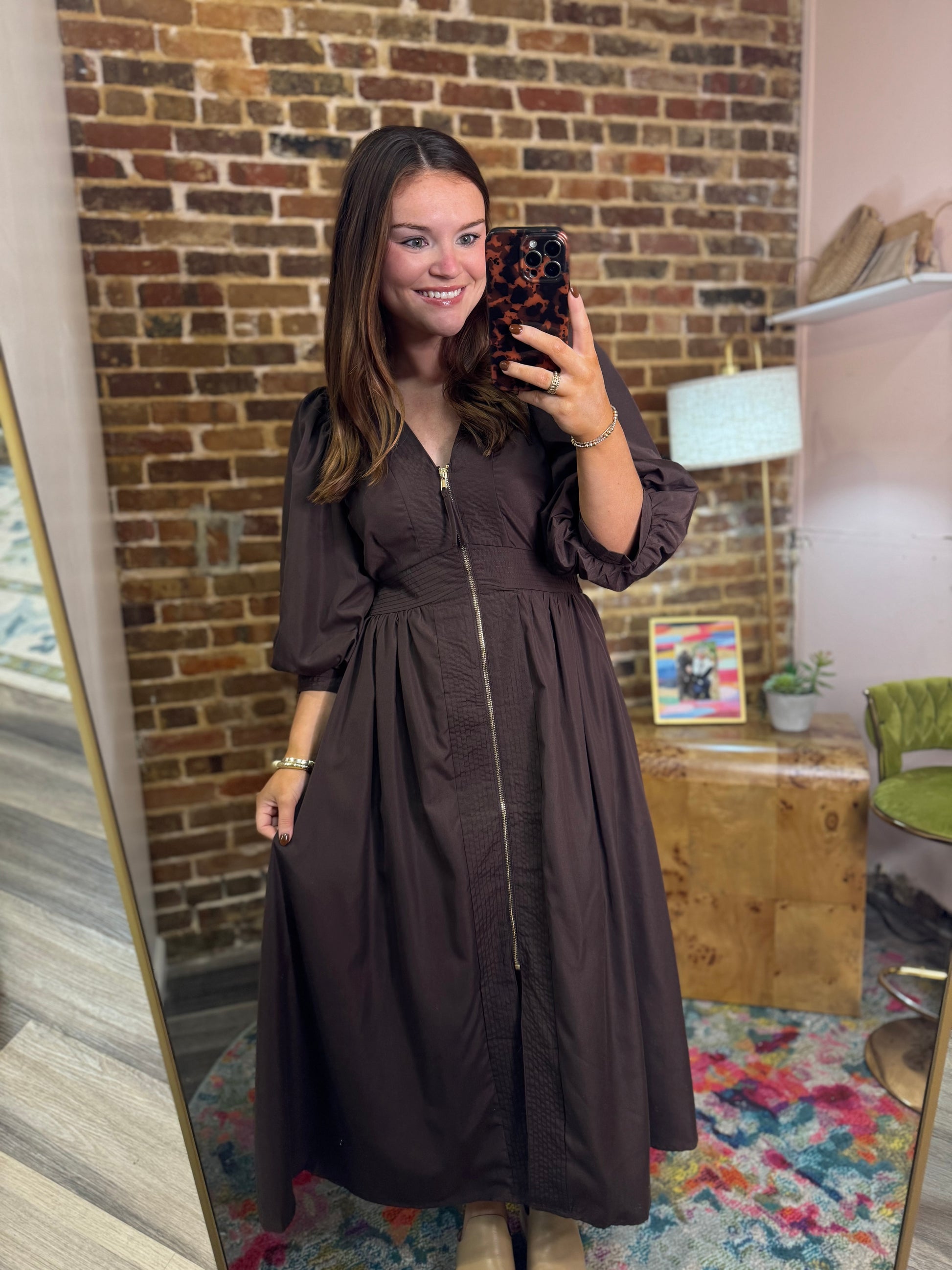 Solid ¾ sleeve midi dress featuring smocked waistband. Zipper closure at front. Side pockets. Lined. Woven. Non-sheer. Lightweight.